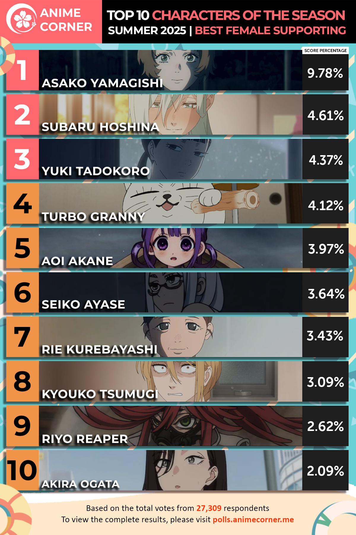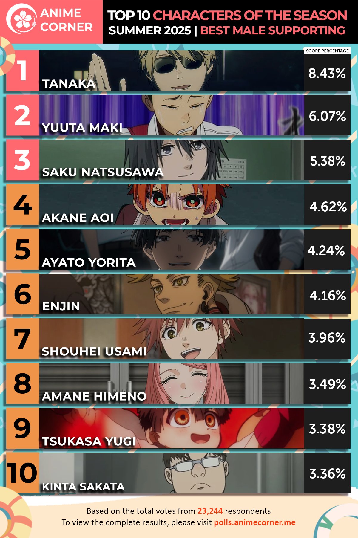 A 2025 nyári anime díjak támogató karaktereire vonatkozó szavazási eredmények megérkeztek! A legjobb férfi támogató karakterek között Tanaka a The Summer Hikaru Died című animeből első helyen végzett, míg a második Yuta Maki, szintén ebből az animéből. Őket követi Saku Natsusawa a The Fragrant Flower Blooms with Dignity című sorozatból, valamint Akane Aoi a Toilet-bound Hanako-kun 2. évadából.
